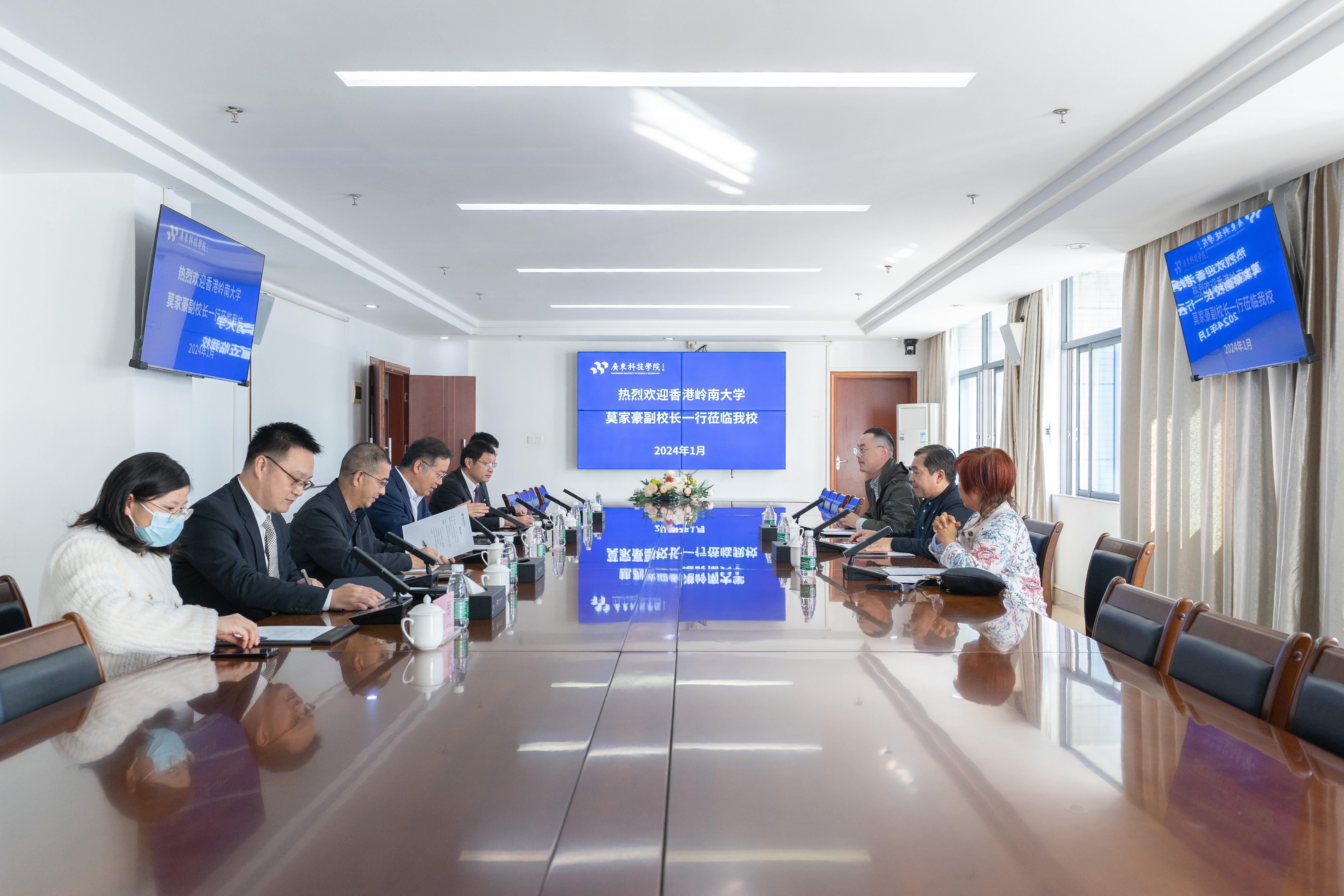 本网讯(国际教育学院)1月3日,香港岭南大学副校长莫家豪一行来访我校,双方就两校合作展开了充分交流。上午,我校副校长李才陪同客人参观了松山湖校区“一河两岸”校园景观、了解松山湖校区规划建设,并重点考察了学校智慧课室、智慧校园以及产业学院建设情况。