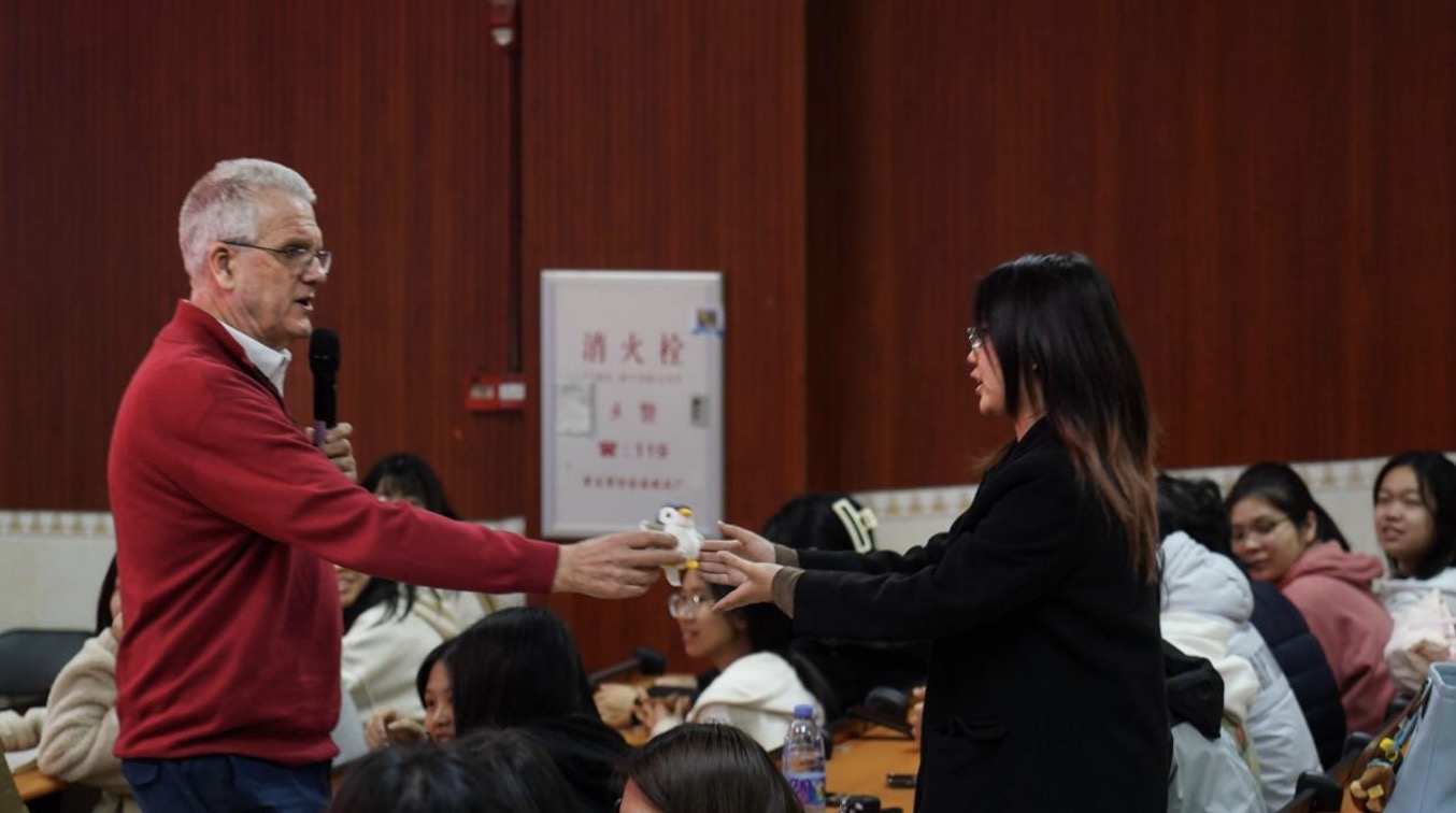 Bill Russell教授用深入浅出的学术叙事与妙趣横生的演讲风格,将复杂理论转化为易于理解的知识要点。他借助“六次大灭绝”“人口模型”“人均 GDP”等历史数据,实证分析了环境变迁、人口变化与经济发展之间的相互作用关系。互动问答环节,现场学生积极参与,学术交流氛围热烈且活跃,思维碰撞,激发了与会师生的深入思考和踊跃表达的热情。邓迪大学还为表现突出的参与者颁发了该校特色纪念品——小企鹅玩偶,作为跨文化学术交流的实体见证。