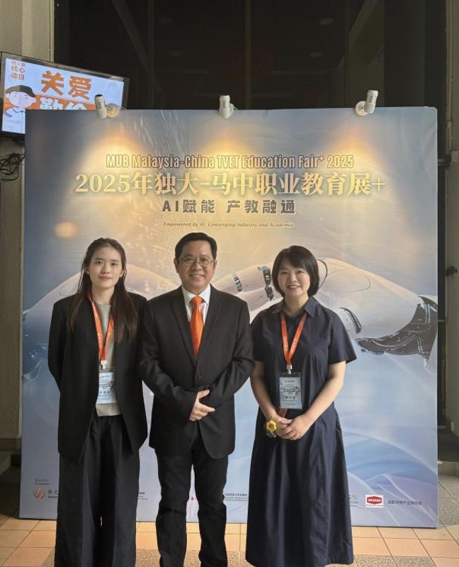 (我校代表与2025年独大-马中职业教育展工委会主席(中)合影)
